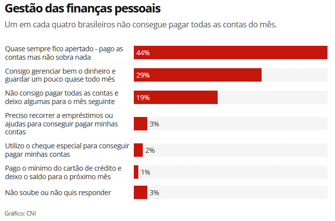 A situação é um pouco melhor para 44% dos brasileiros, que afirmam que conseguem pagar todas as contas – mas que não sobra nada. Nesse cenário, 7 em cada 10 brasileiros não conseguem guardar dinheiro.