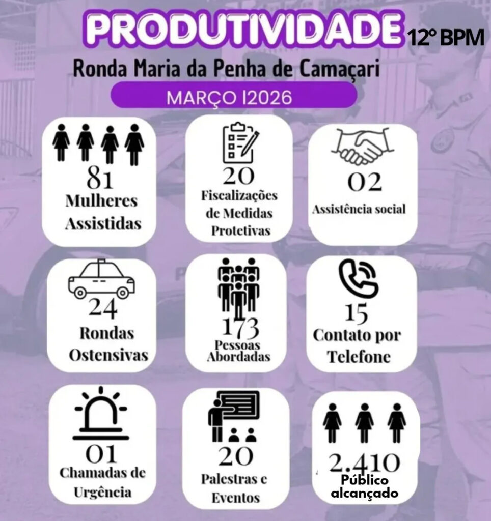O comando do 12º Batalhão de Polícia Militar de Camaçari (12º BPM) apresentou o relatório de produtividade referente ao mês de março de 2026. Entre os destaques das ações policiais estão as ocorrências envolvendo drogas, prisões efetuadas, apreensões de armas, recuperação de veículos roubados e furtados, além das atividades da Ronda Maria da Penha.
