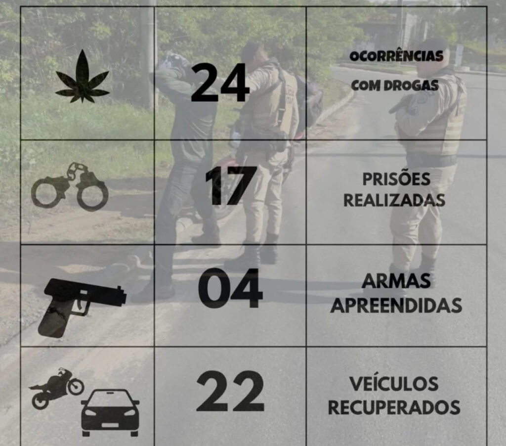 O 12º BPM avaliou os números como “resultados expressivos no enfrentamento à criminalidade”. Durante o último mês, foram registradas 24 ocorrências com drogas, 17 prisões, quatro armas apreendidas e 22 veículos recuperados.