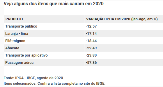 Há também produtos cujo preço medido pelo IPCA caiu, o que balanceia a medição geral. O filé-mignon e o abacate caíram quase 20% em 2020. Ao todo, o conjunto das carnes caiu pouco menos de 2%, mas itens como salsicha, carnes industrializadas, frango, linguiça e peixes subiram.
