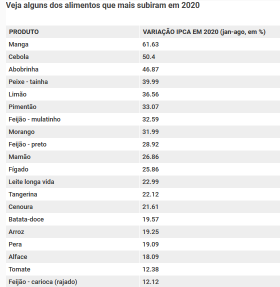 O produto que mais subiu em 2020 segundo a variável do IPCA não foi o arroz, mas a manga. A alta da fruta foi de 62%, seguida pela cebola (50%) e pela abobrinha (47%). O arroz aparece só perto do 20º lugar, com alta de 19%. Os diversos tipos de feijão também estão entre os 30 produtos que mais subiram, além do leite longa vida (23%), óleo de soja (19%), alface (18%), entre outros.