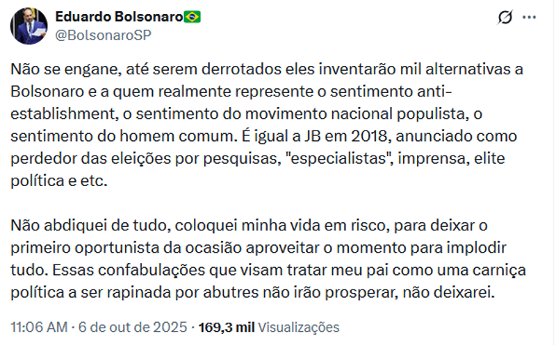 De longe – literalmente – e cada vez mais isolado do núcleo político bolsonarista, Eduardo Bolsonaro (PL-SP) voltou às redes sociais para se queixar das articulações que buscam um novo nome da extrema-direita para disputar a Presidência em 2026.