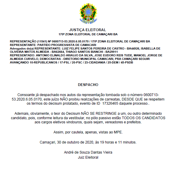 O juiz eleitoral da 170ª zona de Camaçari, André de Souza Dantas Vieira, através de despacho emitido na noite de sexta-feira (30/10), informou que as carreatas estão liberadas para acontecer no município.