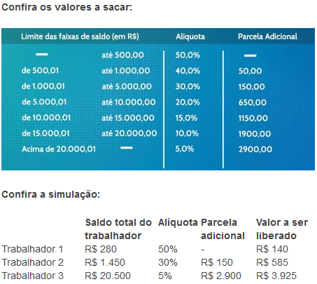 Nos saques-aniversário do FGTS haverá limite de retirada. O valor anual será um percentual do saldo da conta do trabalhador. Para contas com até R$ 500, serão liberados 50% do saldo. Esse percentual será reduzido quanto maior for o valor em conta. Para as contas com mais de R$ 500, os saques serão acrescidos de uma parcela fixa (veja abaixo). Portanto, os cotistas com saldo menor poderão sacar anualmente percentuais maiores.