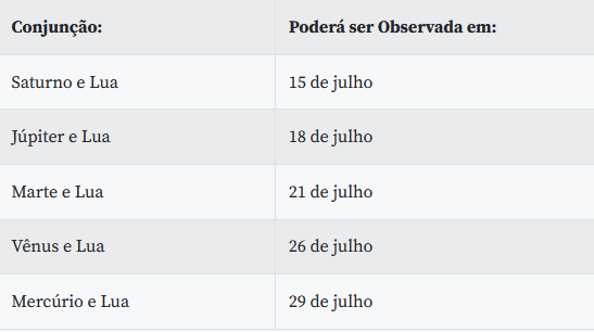 Além das observações, o mês também reserva eventos astronômicos para aqueles que possuem crenças relacionadas ao posicionamento dos astros. Saturno, Júpiter, Mercúrio, Marte e Vênus terão conjunções lunares que poderão ser observadas no céu da manhã. Veja o calendário da Nasa: