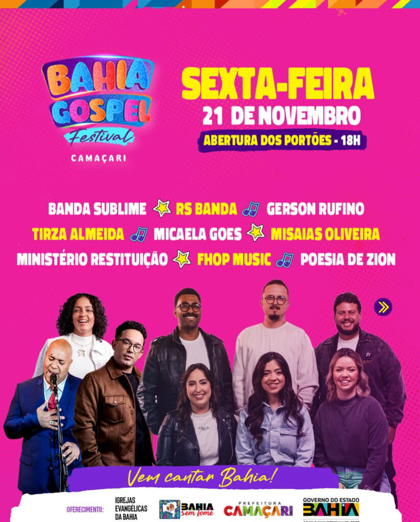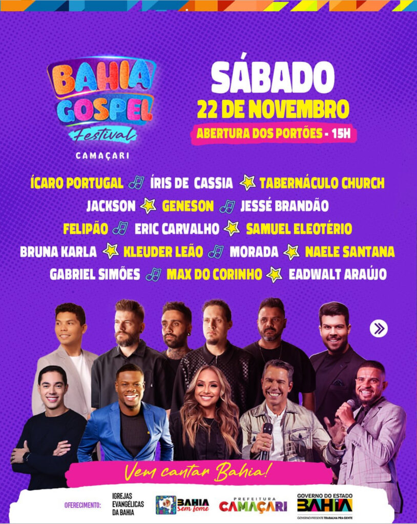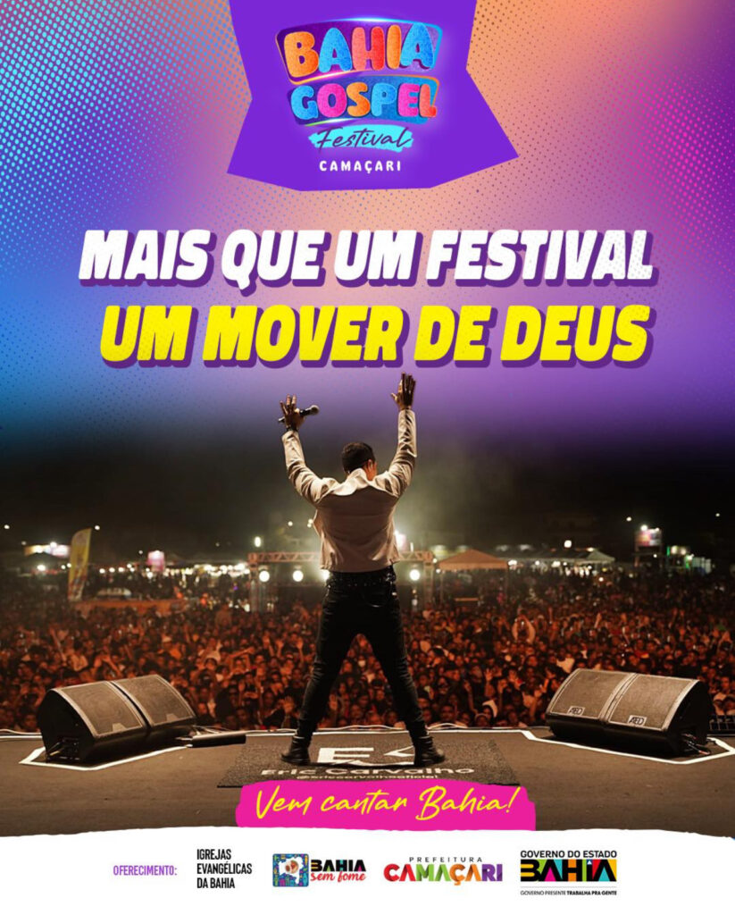 Uma noite de louvor, fé e adoração. Camaçari recebe nos dias 21 e 22 de novembro, um dos maiores eventos estaduais de música gospel da Bahia, o Bahia Gospel Festival Camaçari 2025. Com nomes de peso da música gospel brasileira e atrações locais, o festival é promovido pelo Governo do Estado em parceria com a Prefeitura de Camaçari.