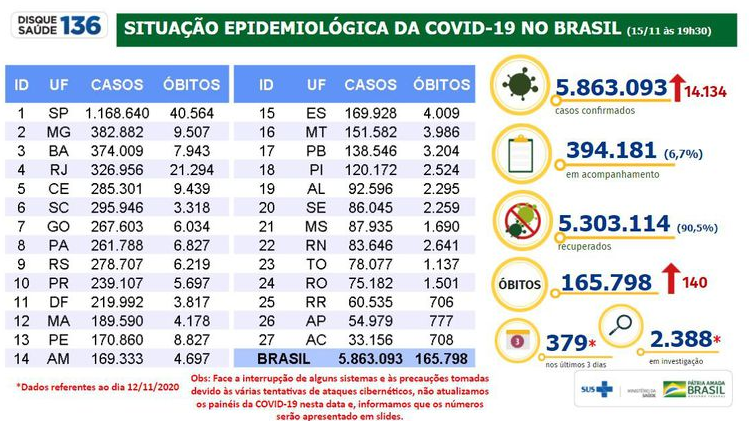 Números atualizados pelo Ministério da Saúde mostram que o Brasil tem 5.863.093 casos acumulados do novo coronavírus, sendo 14.134 confirmados nas últimas 24 horas. Desde o início da pandemia, 165.798 pessoas morreram por causa da covid-19 no país. Nos últimos três dias foram registrados 379 óbitos. Os dados foram enviados pelas secretarias municipais e estaduais de Saúde e compilados pelo Ministério da Saúde às 19h deste domingo (15).