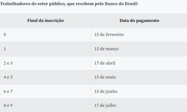 Para servidores públicos, militares e empregados de estatais, inscritos no Pasep, a liberação ocorre pelo Banco do Brasil, nas mesmas datas do PIS. Nos dois casos, no PIS e no Pasep, o dinheiro estará disponível até 28 de dezembro. Após esse prazo, os recursos voltam para o caixa do governo.