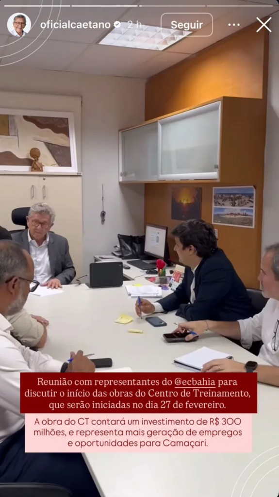 A informação foi revelada por Luiz Caetano (PT), prefeito de Camaçari, onde o CT será construído. Através nas redes sociais, o petista publicou o registro de uma reunião com representantes do Tricolor.
