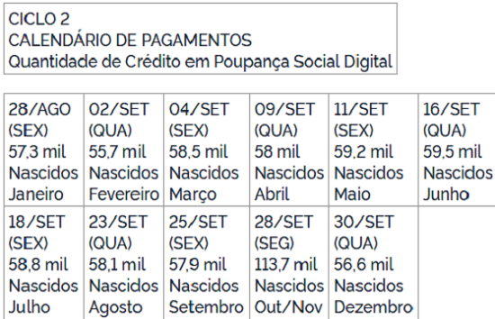 O novo calendário também abrange as pessoas que receberam a primeira parcela em meses anteriores, mas tenham tido o pagamento reavaliado em agosto de 2020. Inicialmente os valores serão depositados na poupança social digital, podendo ser usados para o pagamento de contas e realização de compras por meio do cartão de débito virtual. Posteriormente os recursos serão liberados para saques e transferências. Segundo a pasta e medida visa evitar aglomerações para minimizar o risco de propagação do novo coronavírus (covid-19).