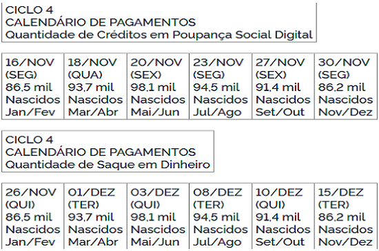 As duas parcelas restantes serão pagas de 16 de novembro a 30 de novembro, com saques liberados de 26 de novembro a 15 de dezembro.