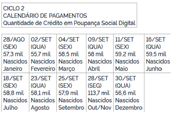 O novo calendário também abrange as pessoas que receberam a primeira parcela em meses anteriores, mas tenham tido o pagamento reavaliado em agosto de 2020. Inicialmente os valores serão depositados na poupança social digital, podendo ser usados para o pagamento de contas e realização de compras por meio do cartão de débito virtual. Posteriormente os recursos serão liberados para saques e transferências. Segundo a pasta e medida visa evitar aglomerações para minimizar o risco de propagação do novo coronavírus (covid-19).