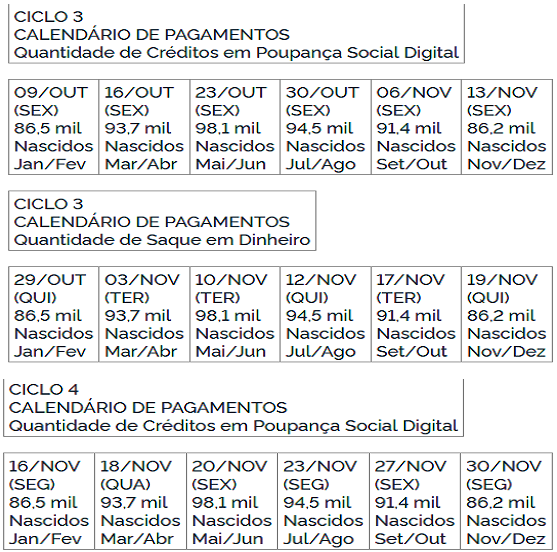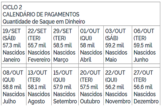 A segunda e terceira parcelas serão pagas de 9 de outubro a 13 de novembro, com saques liberados de 29 de outubro a 19 de novembro. A quarta e quinta parcelas sairão no período de 16 de novembro a 30 de novembro, com saques liberados de 26 de novembro a 15 de dezembro.
