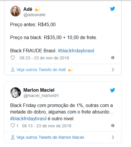 Nas redes sociais, os clientes reclamam que as lojas baixaram os preços das mercadorias, porém, os valores cobrados pelo frete dispararam. Entre os casos citados, há usuários que encontraram valores de entrega de R$1.349,99 para receber um notebook que custa R$ 1.099 durante a campanha de descontos.