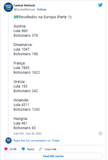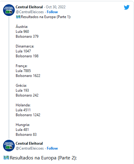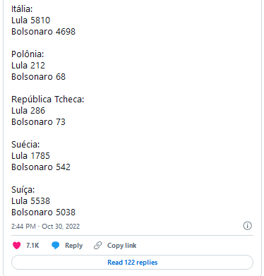 Por fim, Lula também é o preferido dos eleitores brasileiros de Frankfurt, a “capital financeira” da Alemanha: o ex-presidente obteve 67,5% (2.096) dos votos válidos, contra 32,5% (1.008) de Bolsonaro.