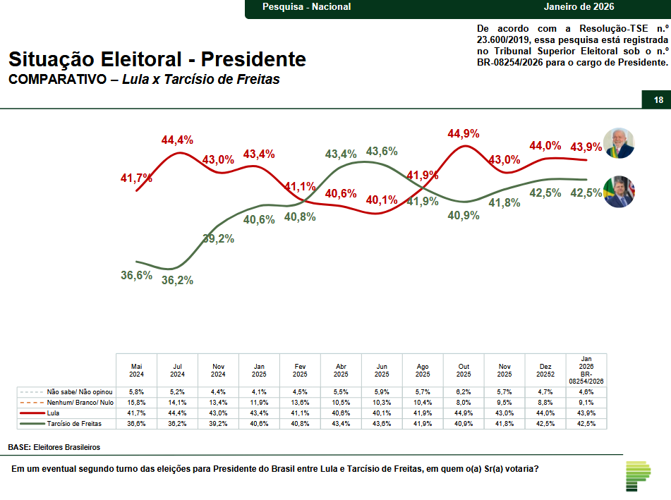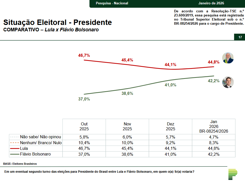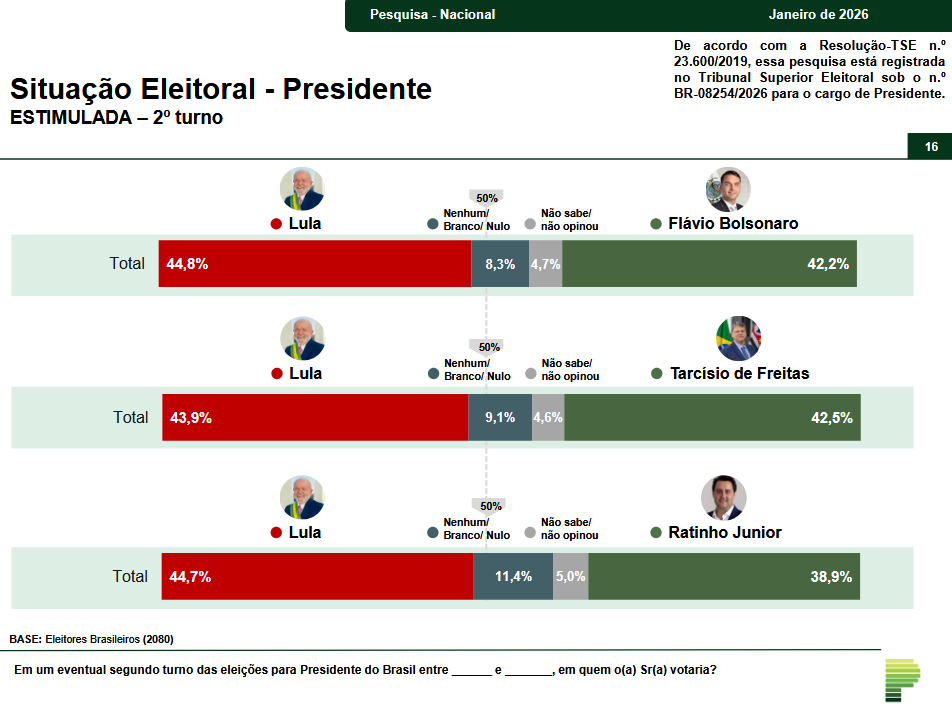 No principal cenário da pesquisa estimulada em primeiro turno, Lula registra 39,8% das intenções de votos, contra 33,1% de Flávio. Em seguida, aparece Ratinho (6,5%), Caiado (3,7%), Zema (2,8%), Santos (1,5%) e Aldo Rebelo, da Democracia Cristã, com 1,1%.