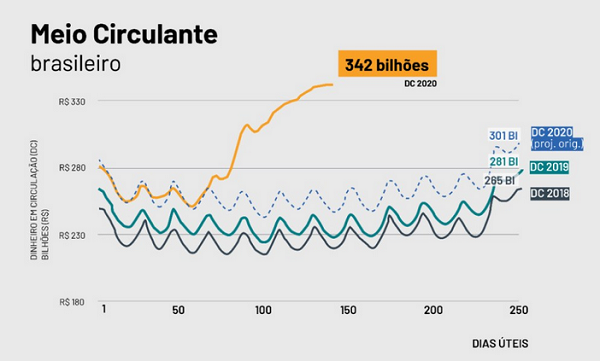 A crise fez o valor em circulação, ou seja, notas emitidas e nas mãos da população, disparar. Hoje, o montante é de R$ 342 bilhões, bem acima da média histórica de menos de R$ 300 bilhões, como mostra o gráfico a seguir.