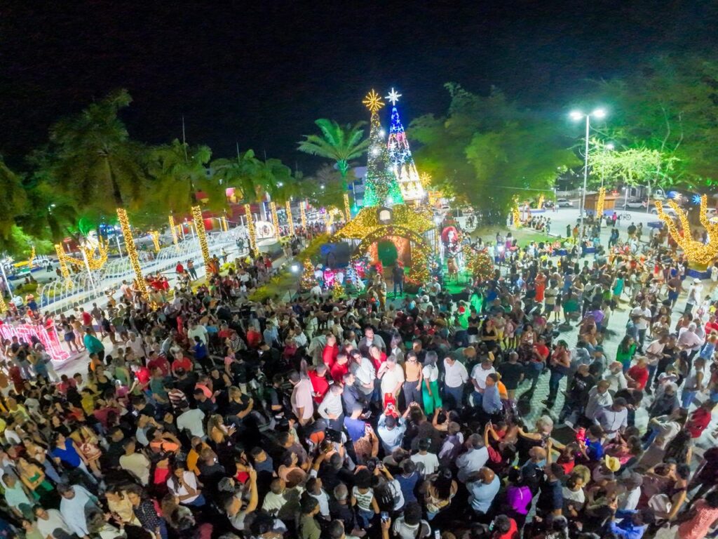 O evento seguiu com a apresentação dos estudantes do 4º ano, que integram o Coral da Escola Municipal Angiolina Teixeira de Souza, ao mesmo tempo em que projeções mapeadas tingiam a fachada da Paróquia Catedral São Thomaz de Cantuária, criando cenas que pareciam sair de um livro ilustrado. O presépio montado no centro da praça recebeu a bênção ministrada pelo pároco da Catedral, padre Milton Pereira.