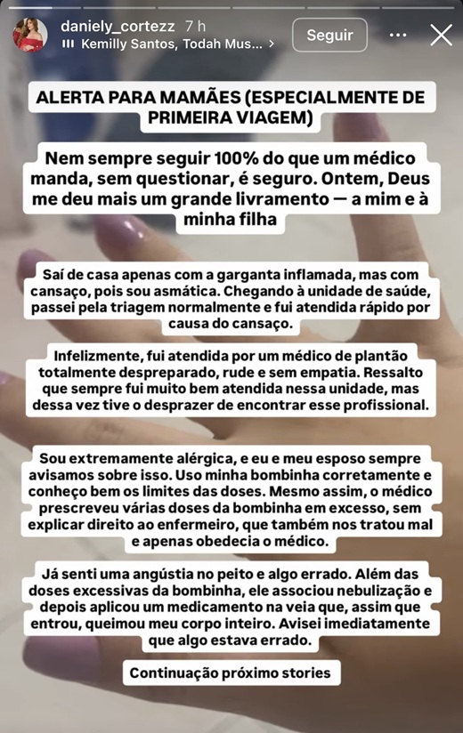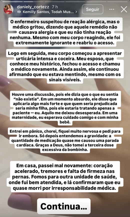 Após o atendimento e a recuperação, a paciente resolveu compartilhar a experiência com seus seguidores e alertar outras gestantes. “Deixo aqui meu alerta: observem os sinais do seu corpo. Nem todo profissional que veste um jaleco sabe realmente o que está fazendo”, finaliza.