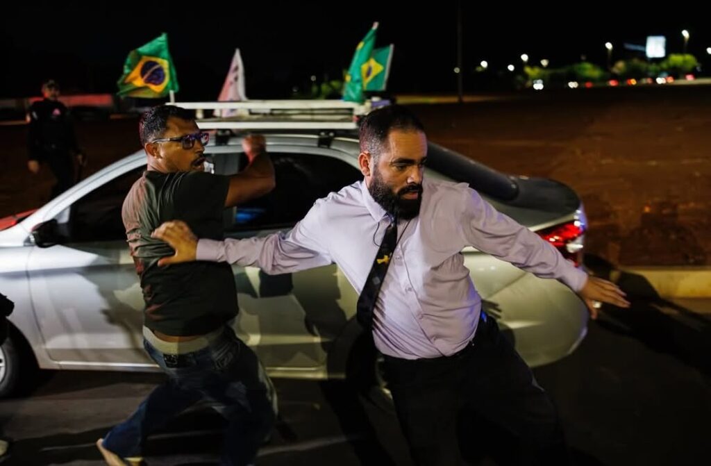 A fala durou poucos segundos antes que o tumulto começasse. O microfone foi arrancado, e parte da multidão partiu para cima do pastor com empurrões, socos e pontapés. A Polícia Militar precisou usar spray de pimenta para contê-los. Após as agressões serem interrompidas, ele foi cercado por jornalistas, que queriam entender o ato de protesto. “Eu vim pra cá para tentar acabar com a instrumentalização da fé que eles fazem”, explicou.