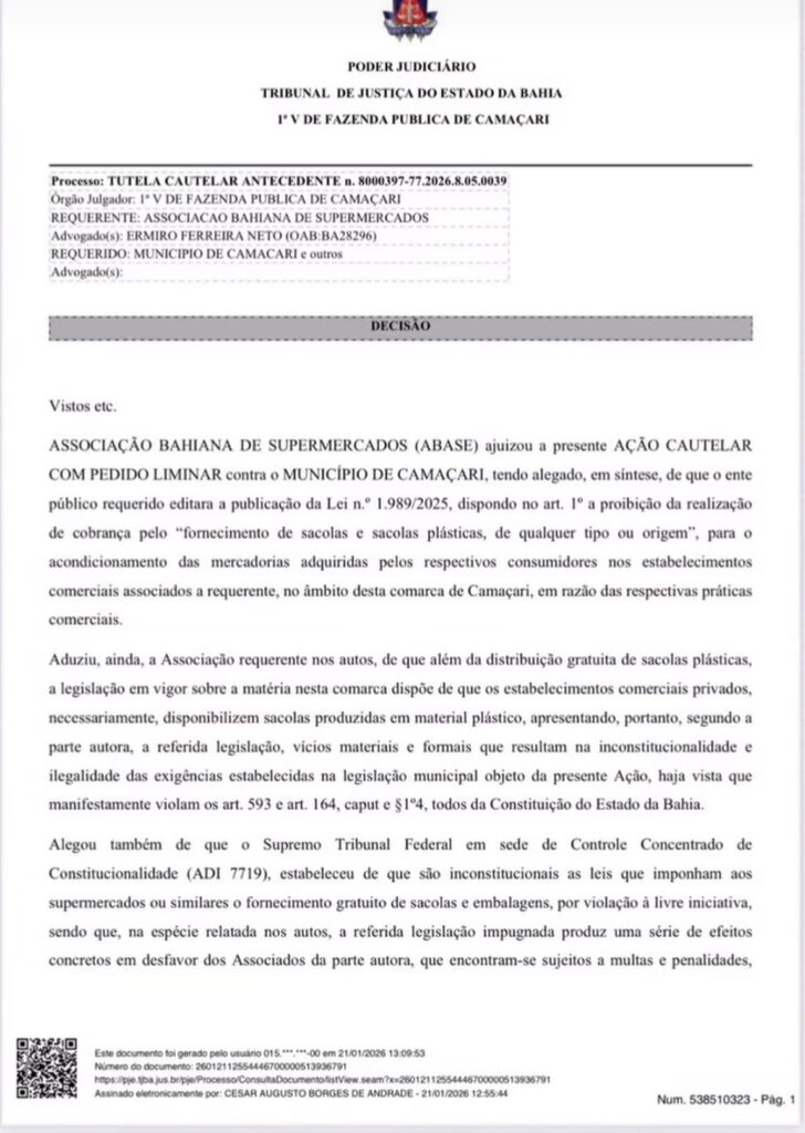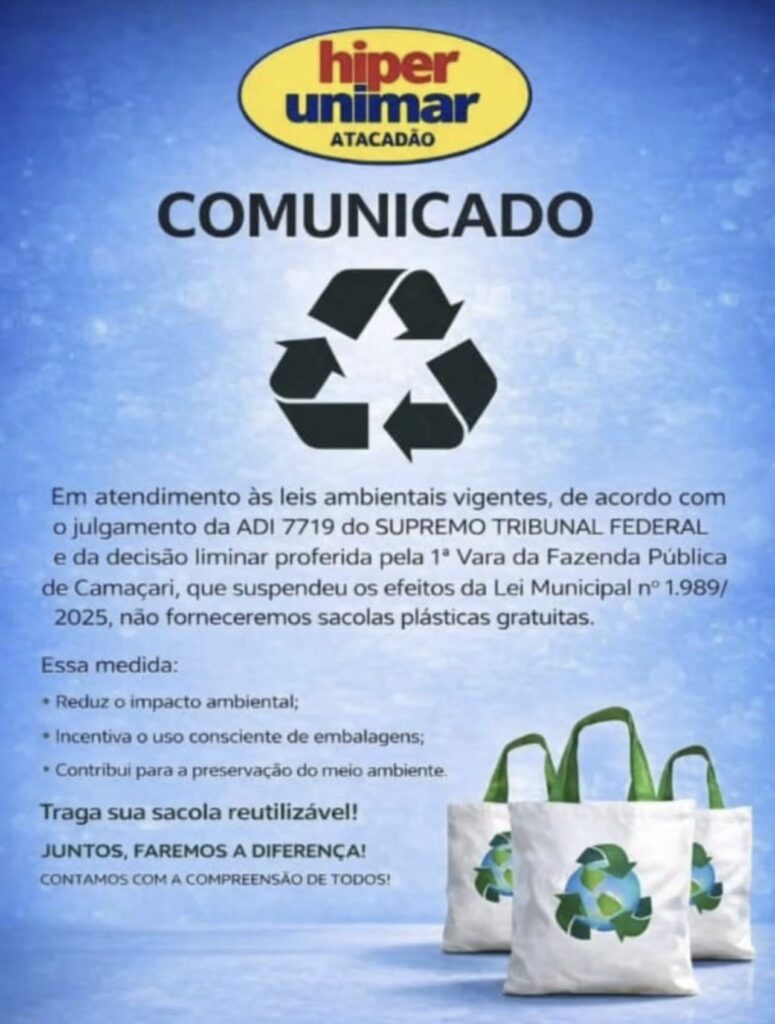 A Lei Municipal nº 1.989/2025, que proíbe a cobrança por sacolas plásticas nos supermercados, hipermercados, atacadistas e varejistas instalados no município foi derrubada por decisão do Supremo Tribunal Federal (STF). A decisão foi estabelecida de acordo com o julgamento da ADI 7719 do STF e da decisão liminar proferida pela 1º Vara da Fazenda Pública de Camaçari.