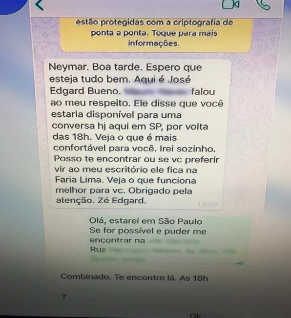 A assessoria de Neymar divulgou uma nota mais cedo comentando o caso, o que acabou levando à implicação de Naves na questão. Segundo os defensores, o pai do camisa 10 foi procurado no dia 29 de maio diretamente pelo advogado José Edgar, que pedi para marcar uma reunião. “A iniciativa para realização do encontro sempre partiu do citado advogado. Também importante reforçar que, na reunião, o advogado apresentou um inaceitável pedido de “cala boca”, prontamente rejeitado. O pedido de dinheiro foi presenciado não por uma, mas por três testemunhas. Por fim, esclarecem que tal fato foi comunicado à autoridade policial e que as testemunhas se encontram à disposição”, diz a mensagem, que cita o nome de alguém – borrado no print divulgado.