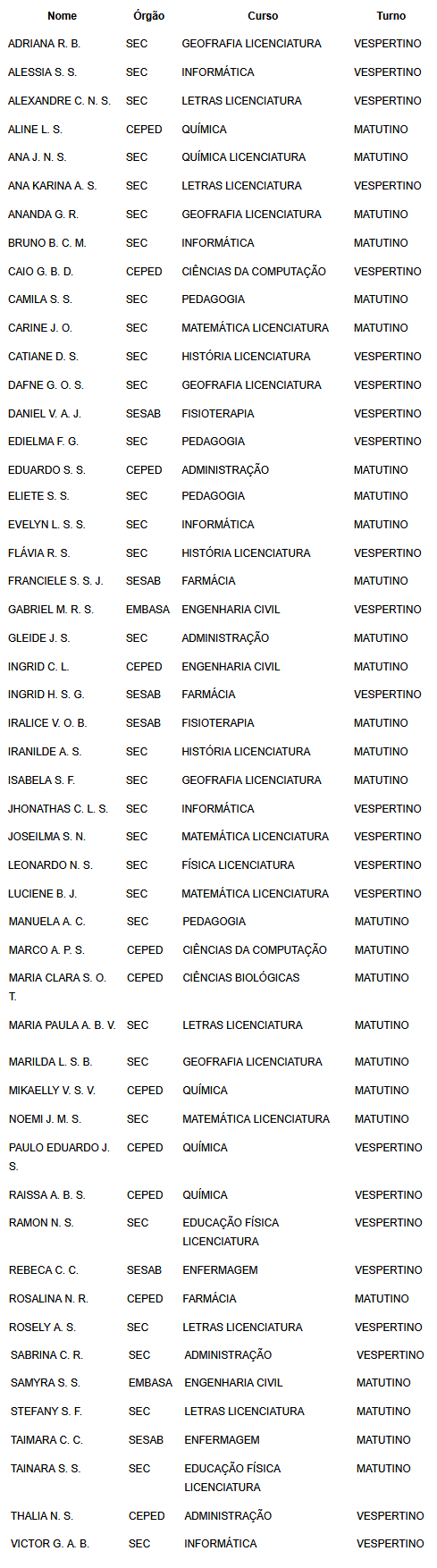 Os cursos com maior número de convocados foram Geografia, com seis estudantes selecionados, seguido por Letras, com cinco. Pedagogia, Química, Matemática e Informática aparecem com quatro convocados cada. Já os cursos de Farmácia e Administração tiveram três selecionados, enquanto Ciências da Computação e Engenharia Civil registraram dois estudantes convocados em cada um. Também foram contemplados, com uma ou duas vagas, os cursos de Física, Educação Física, Fisioterapia, Enfermagem, Ciências Biológicas e História.