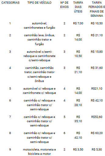 Já para as outras categorias de veículos, como caminhões, ônibus e motocicletas o preço também vai subir. A mudança de valores foi readequada com base no Índice Nacional de Preços ao Consumidor Amplo (IPCA) para cada categoria de veículo, conforme tabela a seguir.