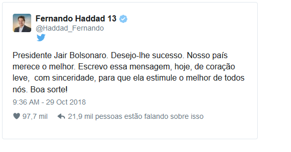 Usando do mesmo expediente de se comunicar pelas redes sociais, largamente utilizado pelo capitão da reserva nessa disputa, Haddad disse em sua conta pessoal na rede de microblog Twitter que deseja sucesso ao presidente eleito.