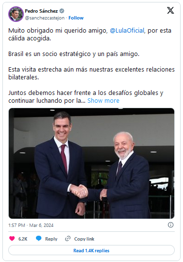 Através das redes sociais, tanto Pedro Sánchez quanto Lula repercutiram a reunião bilateral.