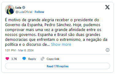 “É motivo de grande alegria receber o presidente do Governo da Espanha, Pedro Sánchez. Hoje, pudemos comprovar mais uma vez a grande afinidade entre os nossos governos. Espanha e Brasil são duas grandes democracias que enfrentam o extremismo, a negação da política e o discurso de ódio, alimentados por notícias falsas. Nossa experiência no enfrentamento da extrema direita, que atua coordenada internacionalmente, nos ensina que é preciso unir todos os democratas. A defesa da democracia está inevitavelmente ligada à luta contra todas as formas de exclusão”, disse o brasileiro.