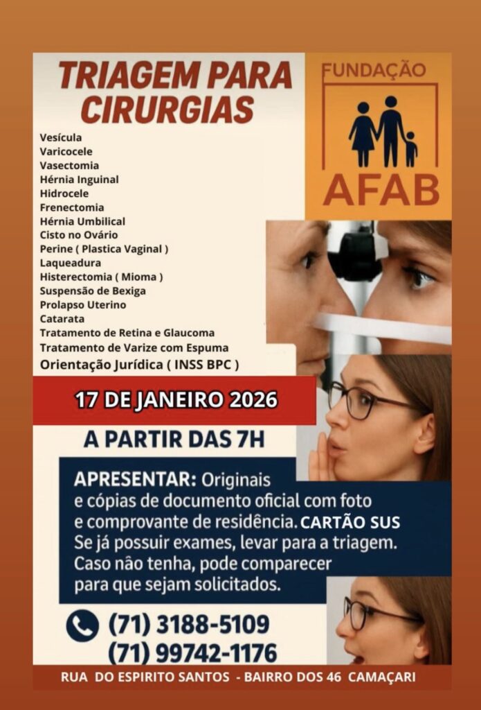 A AFAB – Associação de Apoio a Família e ao Meio Ambiente, realiza neste sábado (17), um mutirão de triagem para cirurgias eletivas. O serviço será disponibilizado na sede da instituição, a partir das 07 horas da manhã, com atendimento por ordem de chegada. Na ocasião, serão ofertados encaminhamentos pra tratamentos cirúrgicos para adultos, cirurgia pediátrica e orientação jurídica para benefícios previdenciários, a exemplo de aposentadoria e Benefício de Prestação Continuada (BPC).