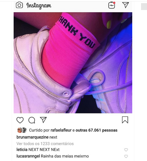 Na legenda, escreveu a palavra ‘next’ (próximo, em inglês). A expressão ‘thank you, next” é inspirada na canção homônima da cantora Ariana Grande e é muito usada nas redes sociais para se referir ao fato da pessoa não se importar mais com o ex e seguir a vida para o próximo.