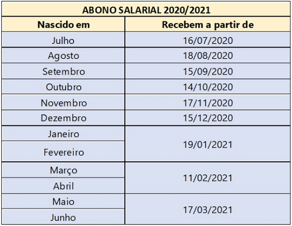 A Caixa divulgou o novo calendário de pagamento do abono salarial 2020/2021, que foi antecipado para o dia 30 de junho. Nessa data, os trabalhadores com direito ao benefício nascidos entre os meses julho e dezembro poderão receber o crédito do benefício automaticamente em suas contas na Caixa. Os valores para cada trabalhador variam de R$ 88 a R$ 1.045, de acordo com a quantidade de dias trabalhados durante o ano-base 2019.