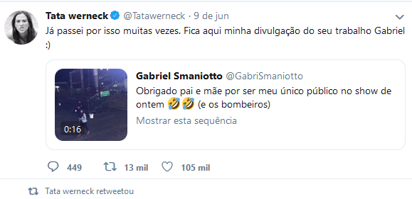 “Já passei por isso muitas vezes. Fica aqui minha divulgação do seu trabalho Gabriel”, postou a apresentadora do “Lady Nigth’.