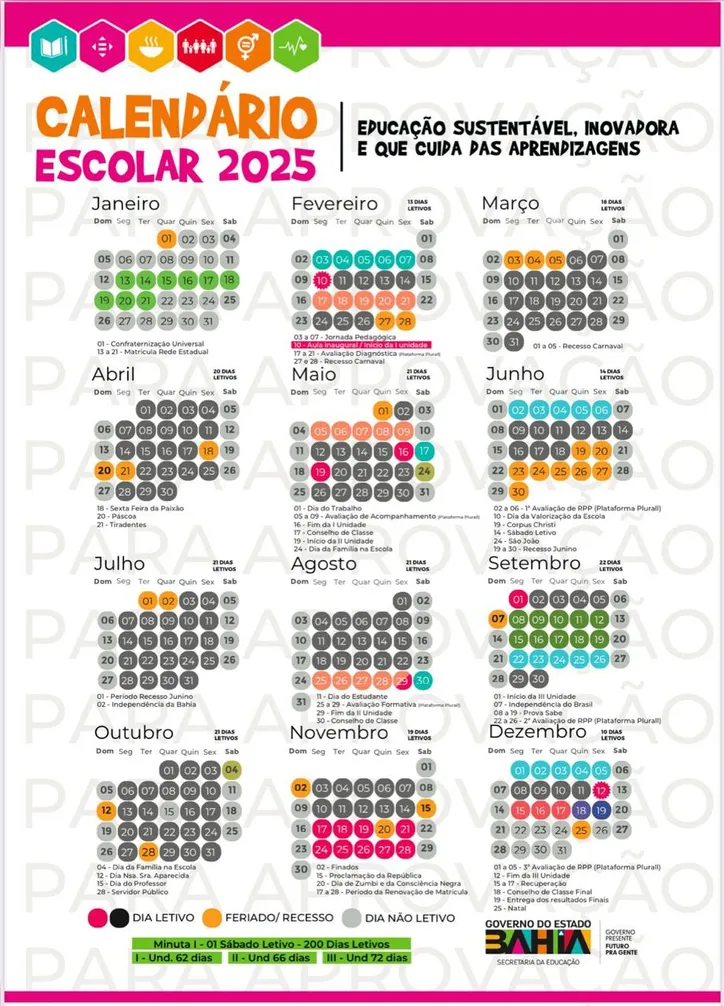 A Secretaria da Educação do Estado da Bahia (SEC) divulgou o Calendário Escolar 2025, que já está disponível para consulta no site oficial educacao.ba.gov.br. O calendário traz, também, informações detalhadas sobre as principais ações programadas para o ano letivo, garantindo organização e planejamento para toda a comunidade escolar.